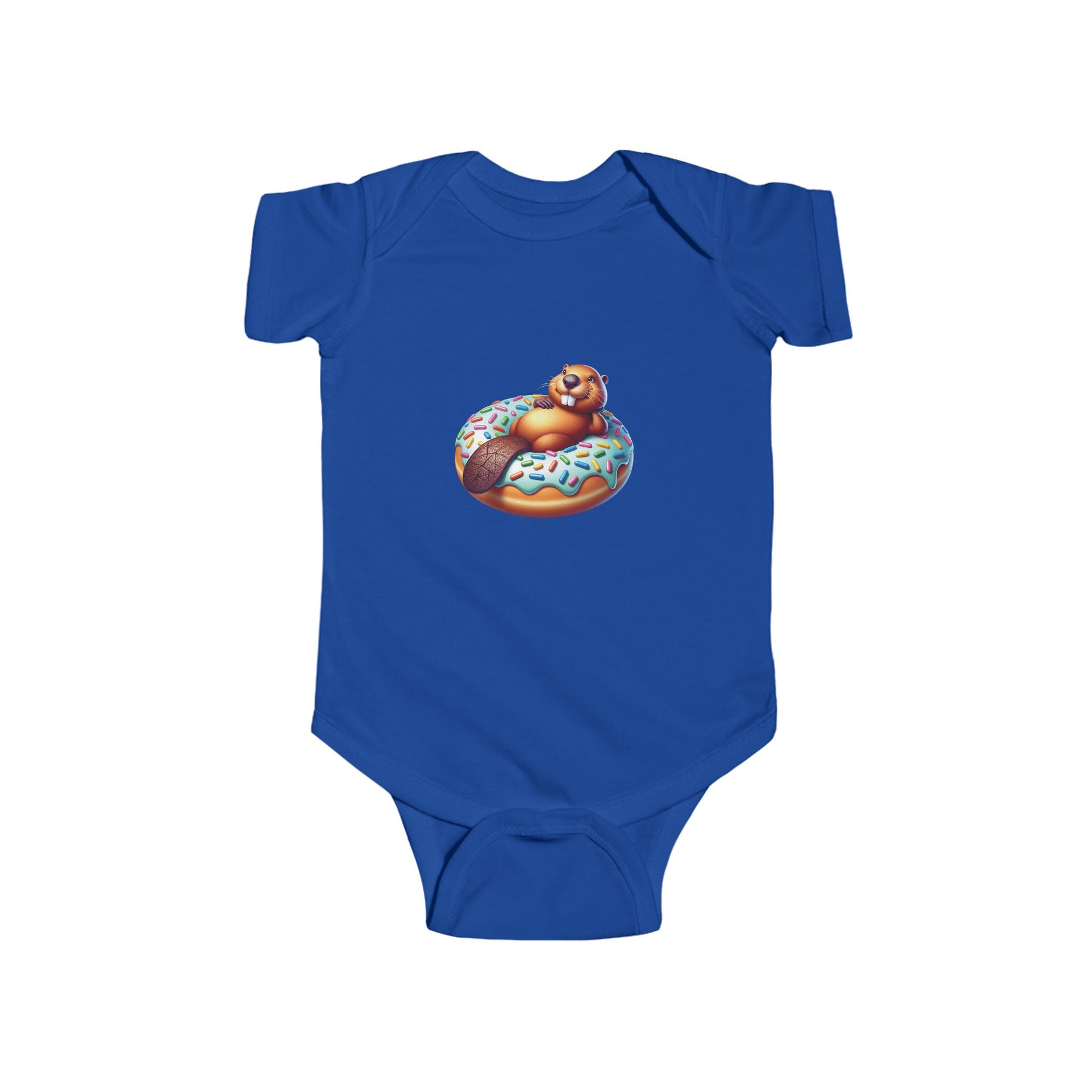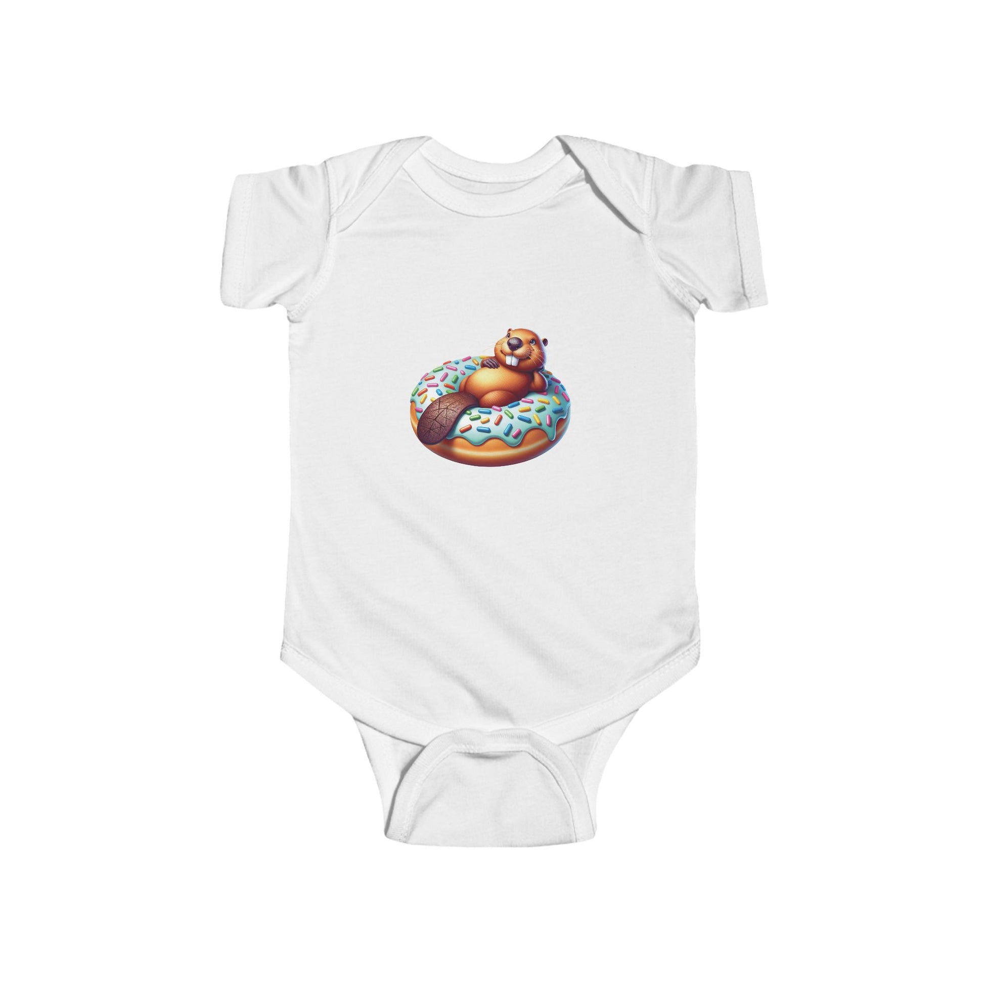 This adorable infant bodysuit features a funny design of a beaver holding a donut, creating a cute and playful vibe. Perfect for little ones to wear on casual days or special occasions. Ideal for parents looking for a unique and charming outfit for their baby. Relevant for baby showers, birthdays, and everyday wear.