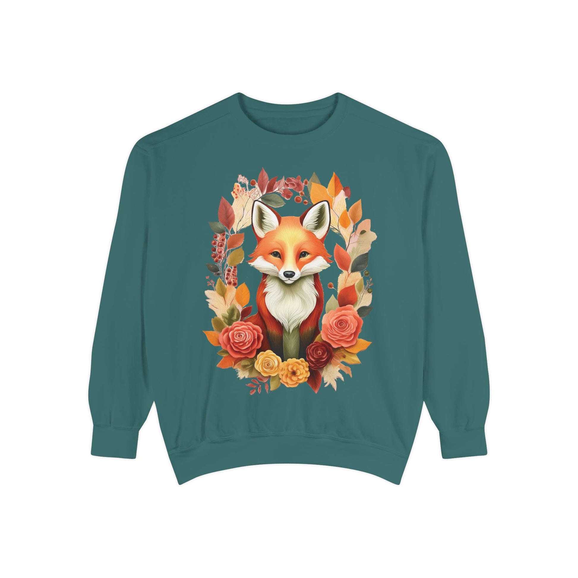Cozy autumn sweatshirt featuring a fox design, perfect for staying warm and stylish during the fall season. This garment-dyed sweatshirt is made of 80% cotton and 20% polyester, providing a soft and luxurious feel. Ideal for adults looking for a comfortable and well-fitted sweatshirt for casual wear or layering.