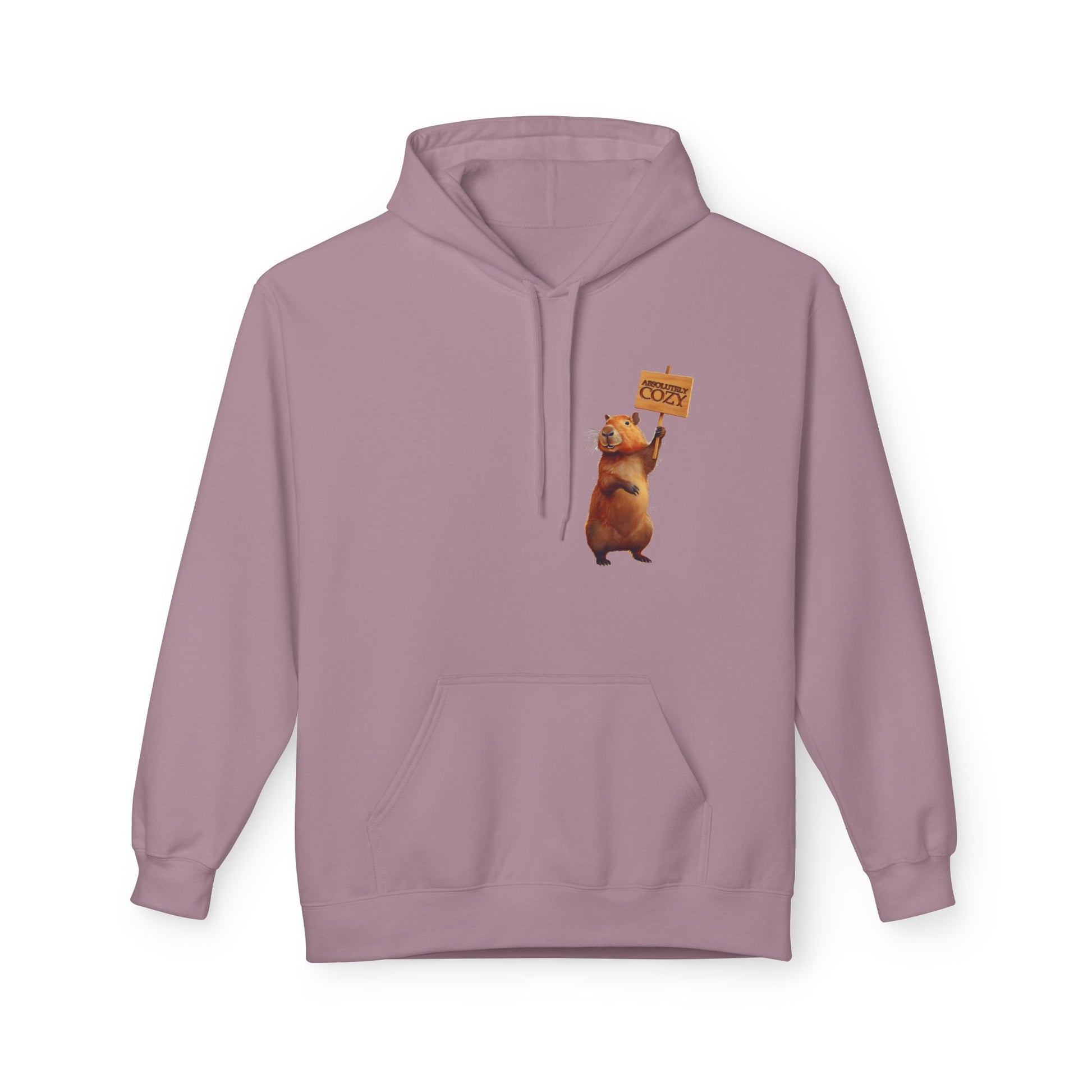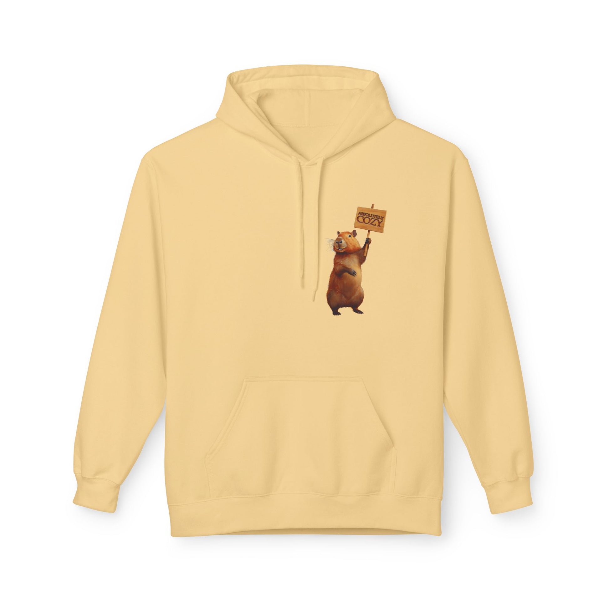 Cozy Capibara design on a unisex midweight softstyle fleece hoodie. Perfect for chilly days, providing warmth and style. Ideal for anyone looking for a relaxed fit and feel.