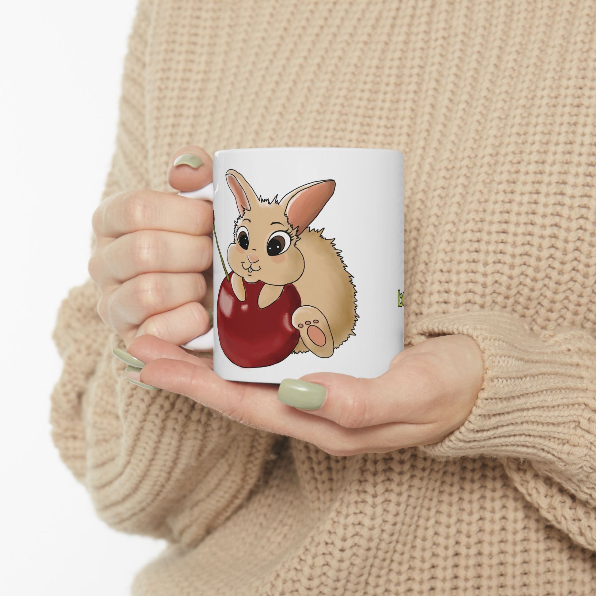 Adorable ceramic mug featuring a cute bunny with a cherry design. Perfect for adding a touch of whimsy to your morning coffee routine or as a lovely gift for someone who loves cute animals and cherries. Ideal for Easter, birthdays, and everyday use.