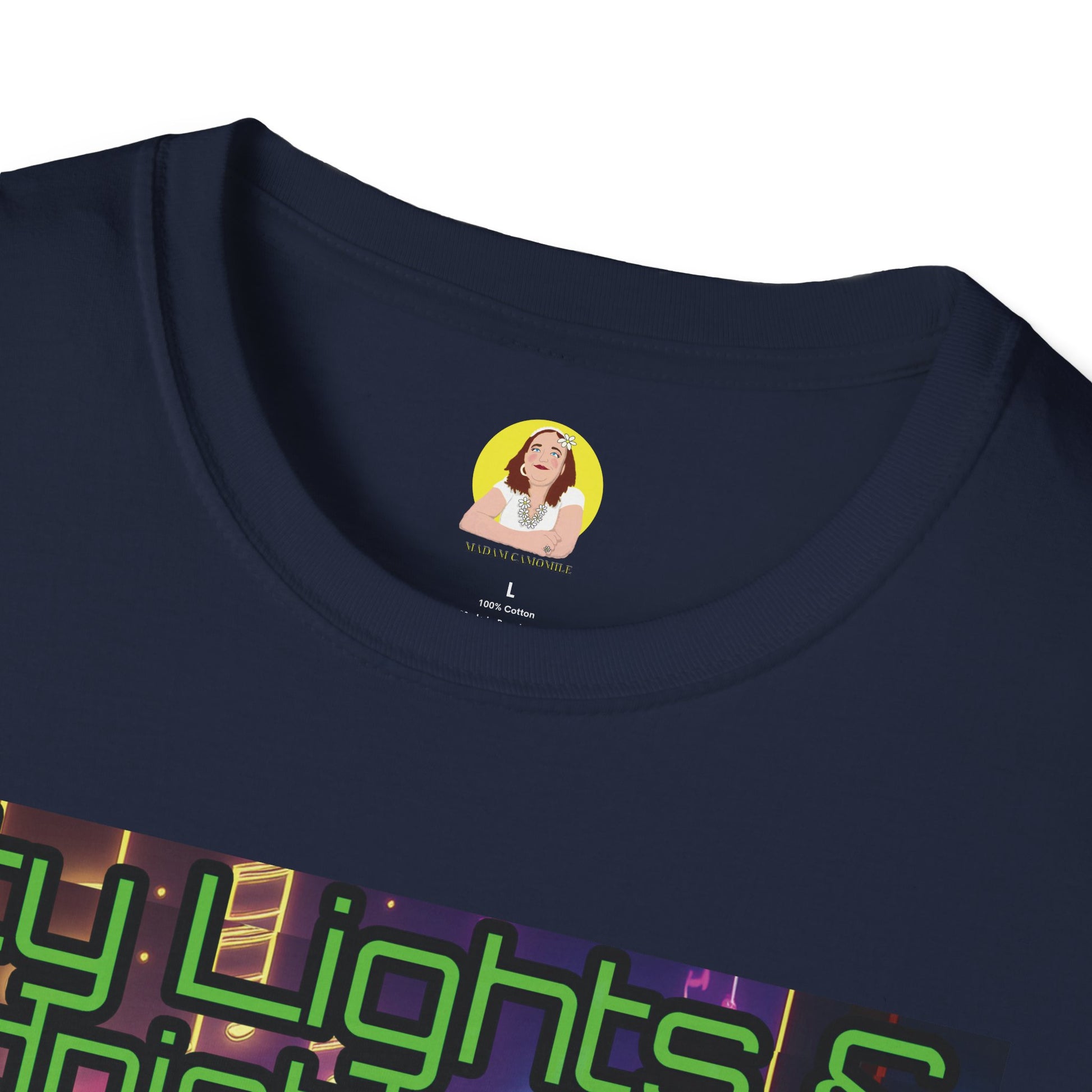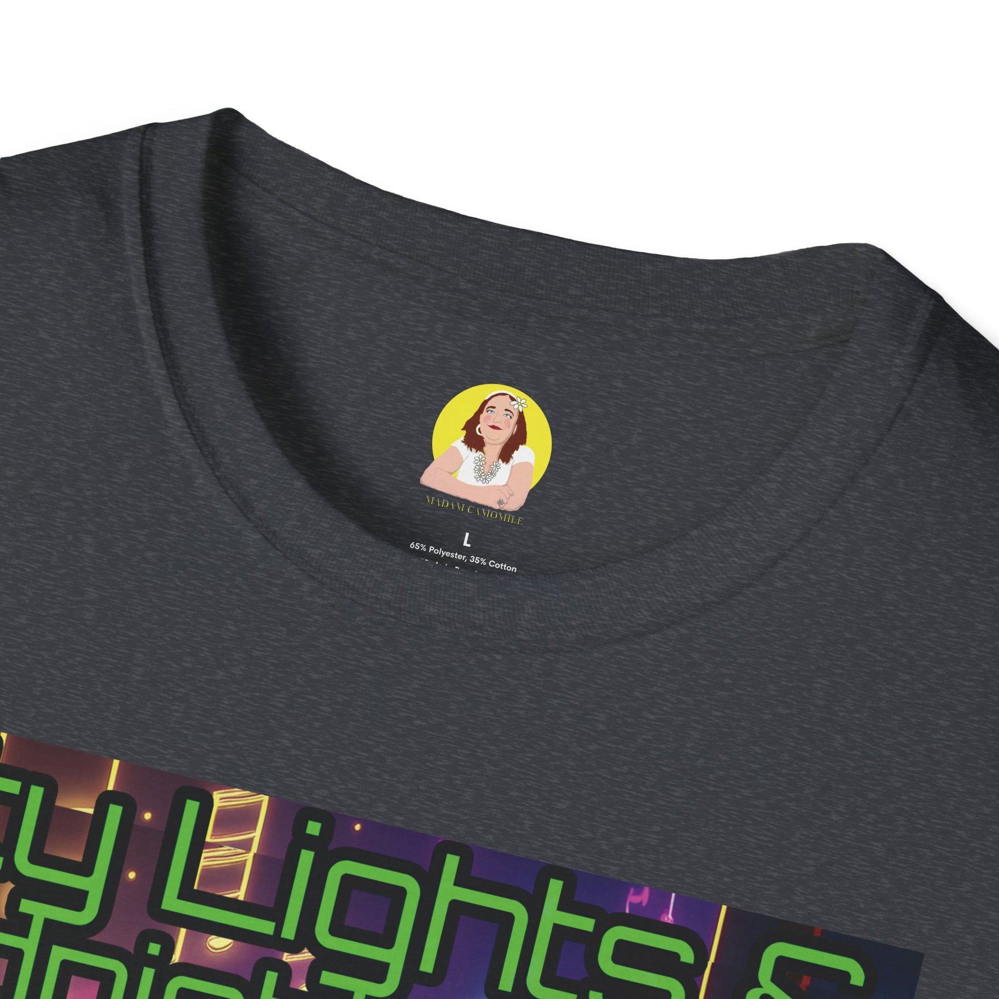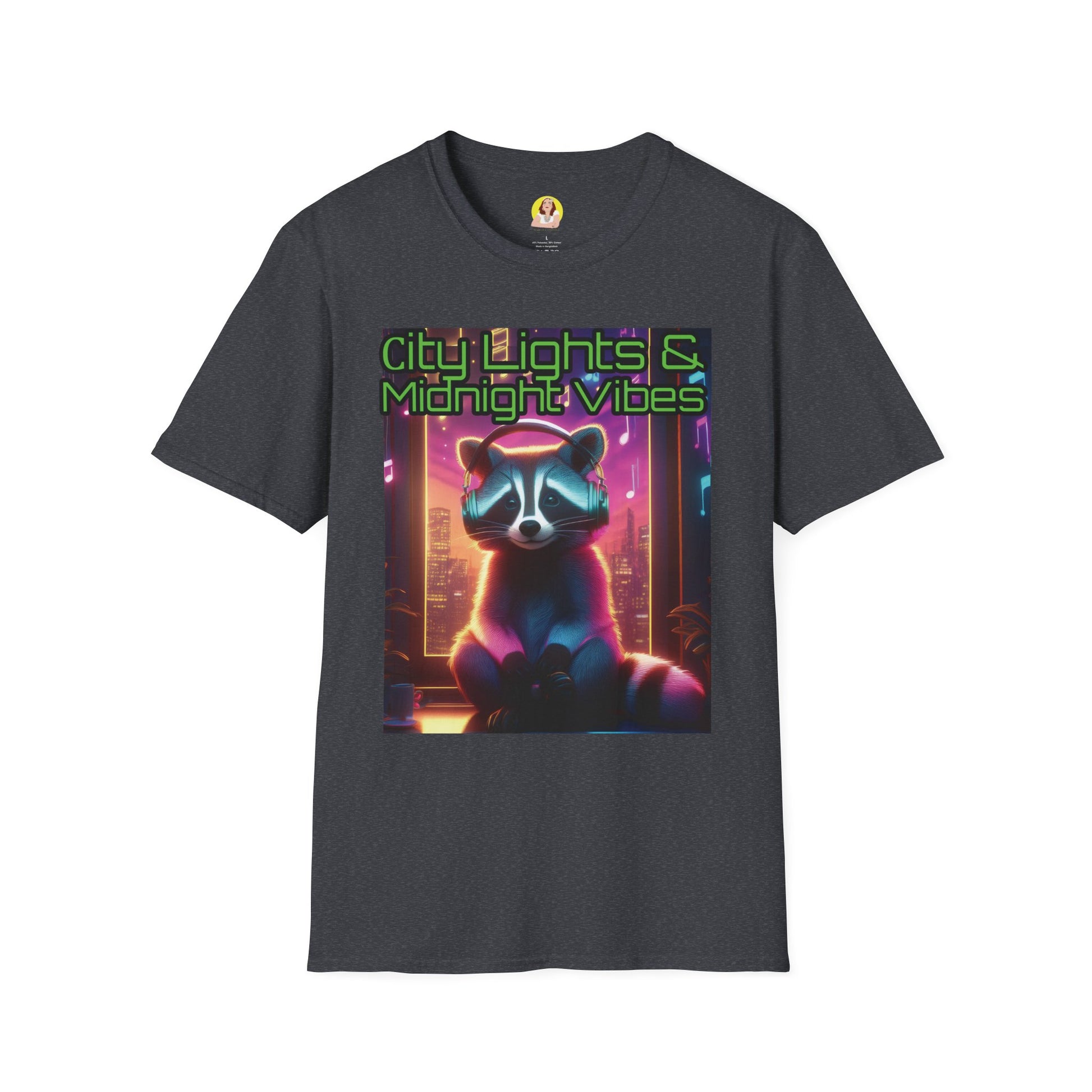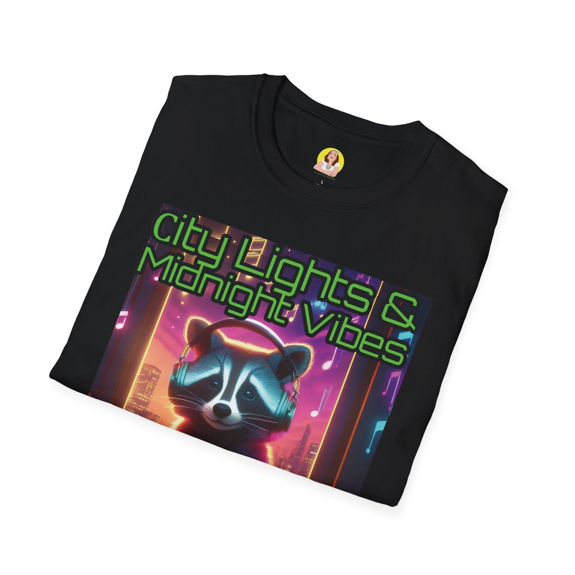 Nighttime Vibes Tee - Raccoon Design, Unisex Softstyle T-Shirt, Graphic Tee, City Lights Apparel, Urban Wear, Gift for Nature Lovers