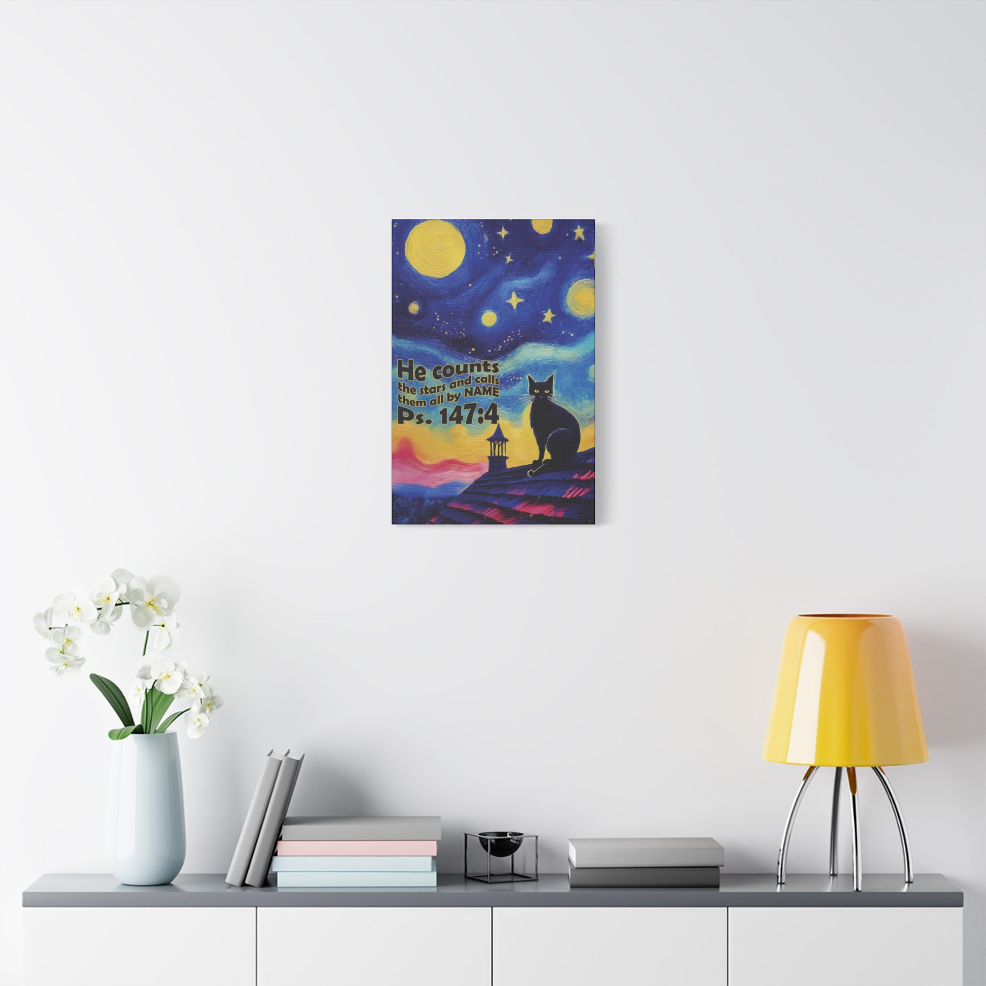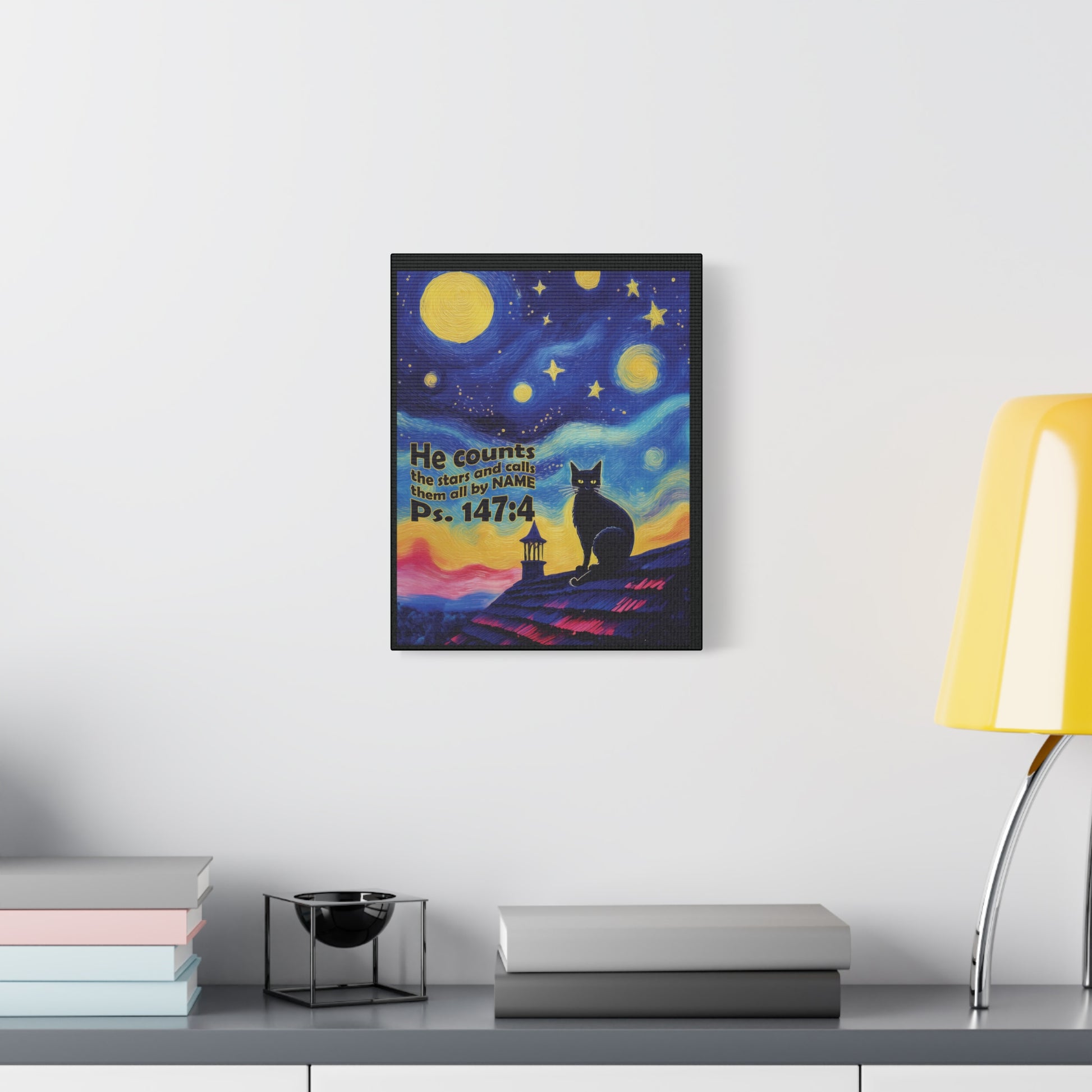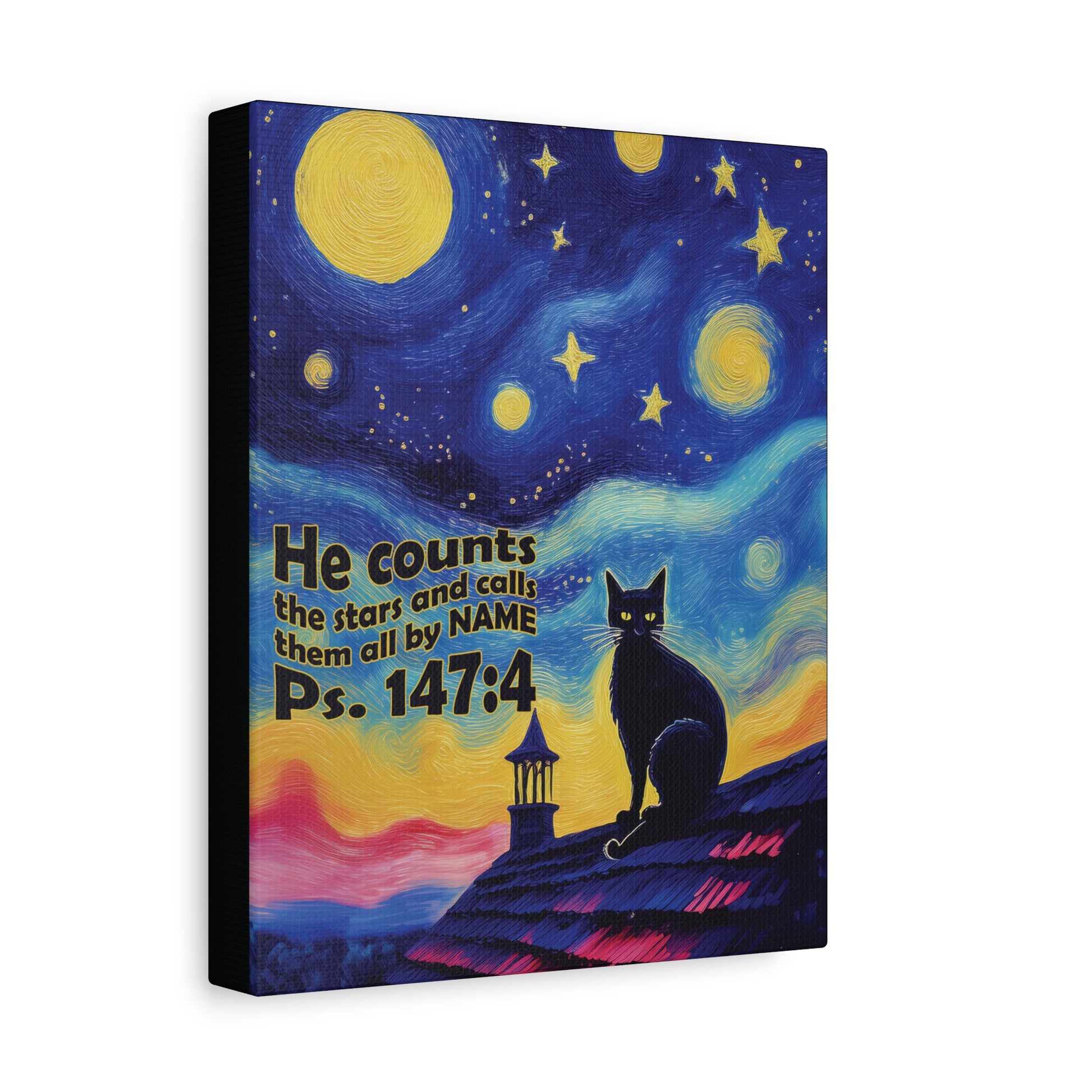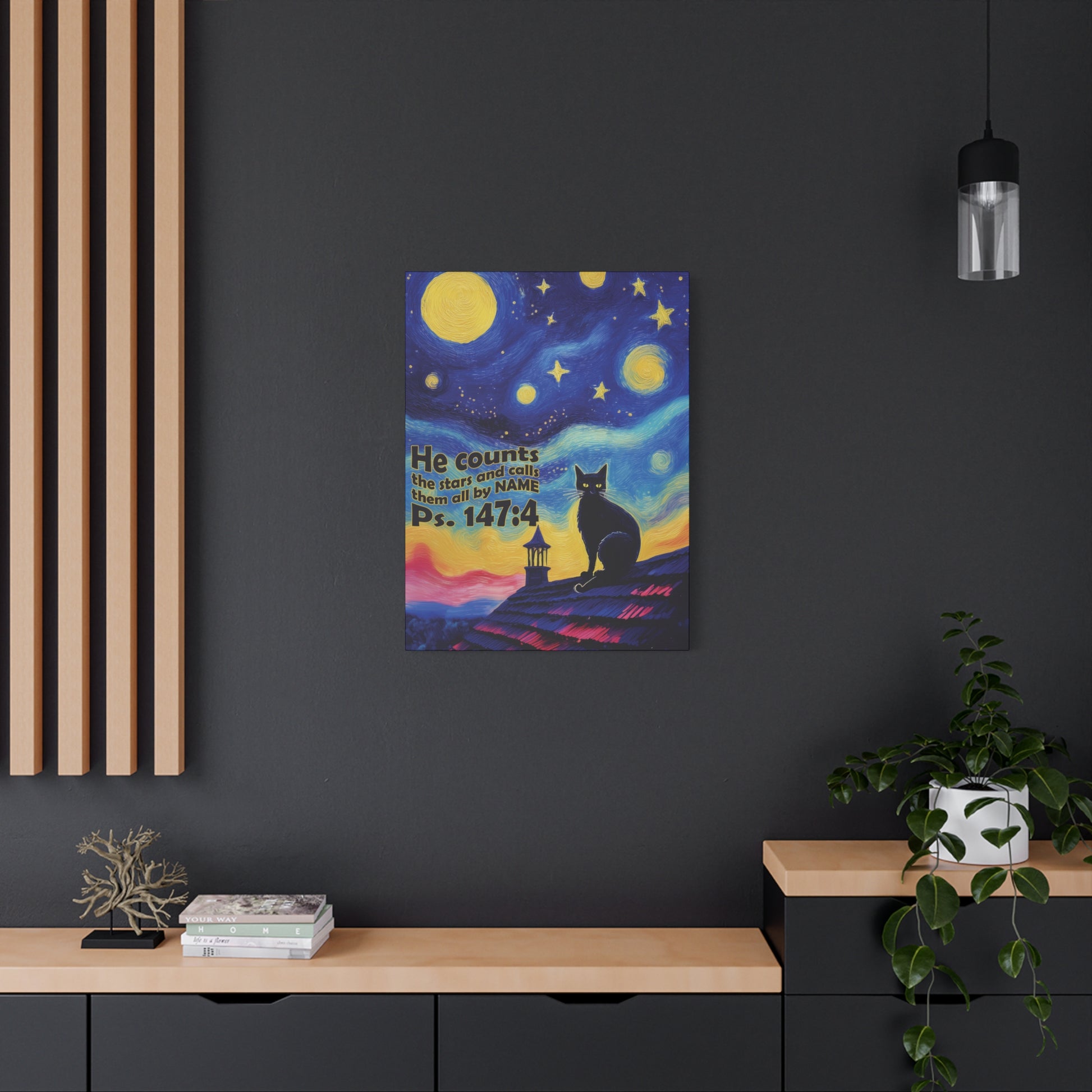 Starry Night Cat Canvas Print, Inspirational Wall Art, Cozy Home Decor, Cat Lover Gift, Psalms 147:4